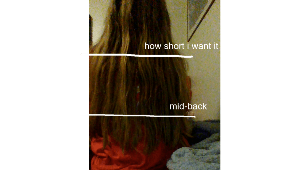 I cant wait! Part of the reason is that im going to be in color guard and it would be easier to have shorter hair than the length i have it, but also because it is so thick and heavy that i cant put it up in ponytails without getting a headache, and every morning i get toothpaste in my hair. Gross. AHHH I’m excited!!!